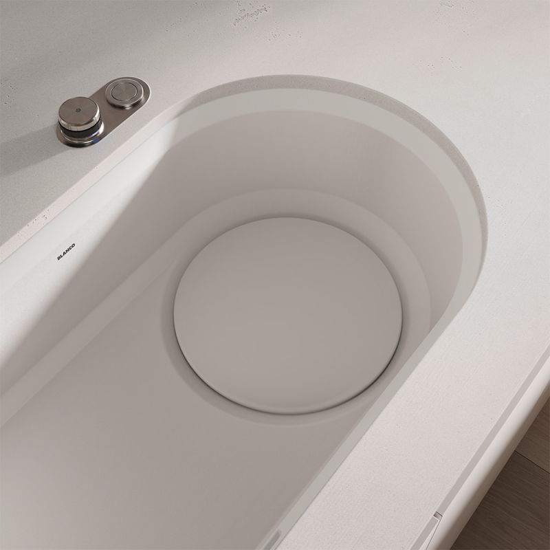 Diskhon är tillverkad i BLANCOs innovativa material VELGRANIT, som kombinerar hög slitstyrka med en sammetslen, matt yta. Materialet är skyddat av BLANCO Protection Shield och är motståndskraftigt mot kalkavlagringar, missfärgning och syror. Fingeravtryck syns minimalt och rengöringen är enkel, vilket gör att diskhon behåller sitt exklusiva utseende över tid. För en enhetlig helhet finns även Oovalon Bundle, med estetiska detaljer särskilt framtagna för Oovalon-serien.