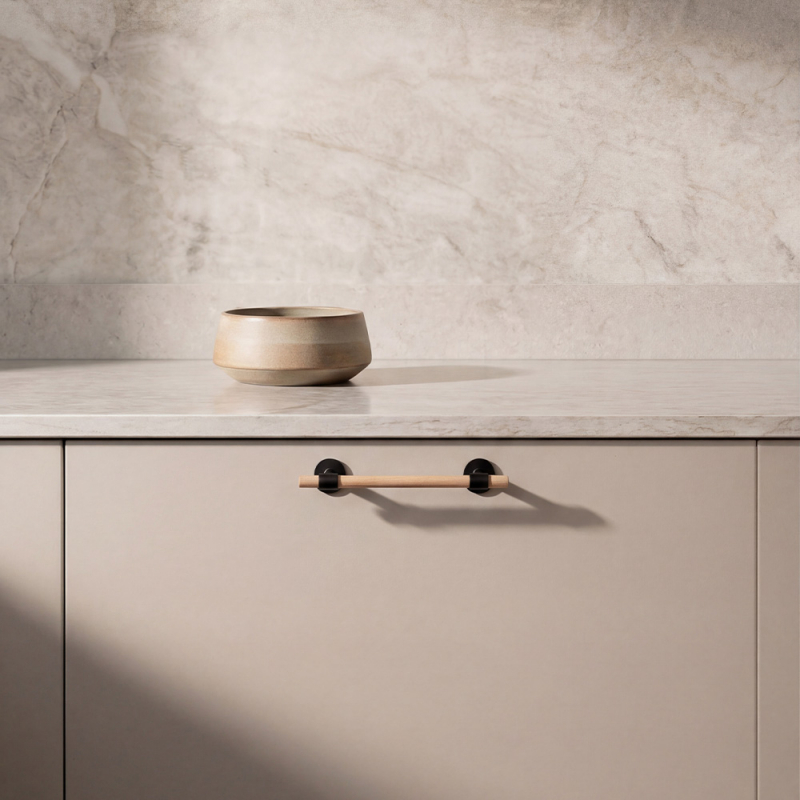 343390-11Handtag Uniform i ek är en vidareutveckling av vår eleganta serie Uniform där trä möter metall i en balanserad och modern design. Den runda greppstången i ek vilar på två cylindriska fästen och skapar ett stilrent uttryck där materialens kontrast ger handtaget en varm och levande karaktär.