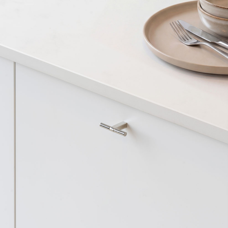343563-11Knopp T Petit kännetecknas av sin nätta och eleganta form. Den cylinderformade greppdelen vilar på en smal, lätt avsmalnande fot som ger knoppen ett balanserat och genomarbetat uttryck. Den T-formade siluetten skapar ett tydligt grepp och tillför en stilren detalj till möbeln – små detaljer som gör skillnad.