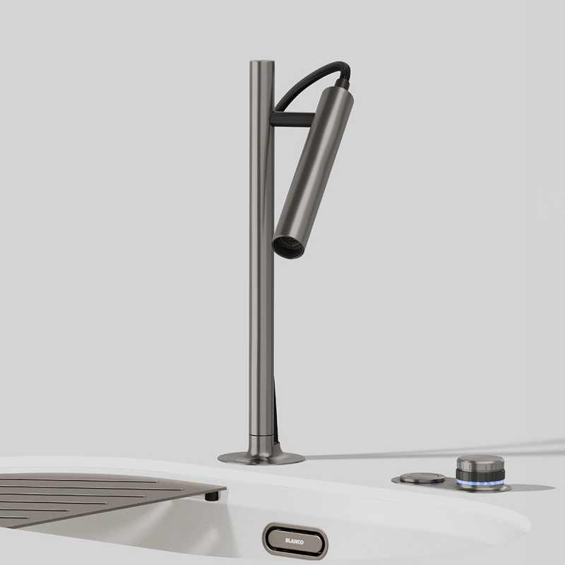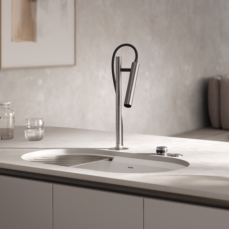 527976Luneoo-S från BLANCO är en modern köksblandare som förenar innovativ design med hög funktionalitet. Med sina avlånga cylindriska former påminner den mer om en elegant inredningsdetalj än en traditionell blandare. Vattnet styrs utan klassisk spak, vilket ger ett rent uttryck som passar det moderna köket.