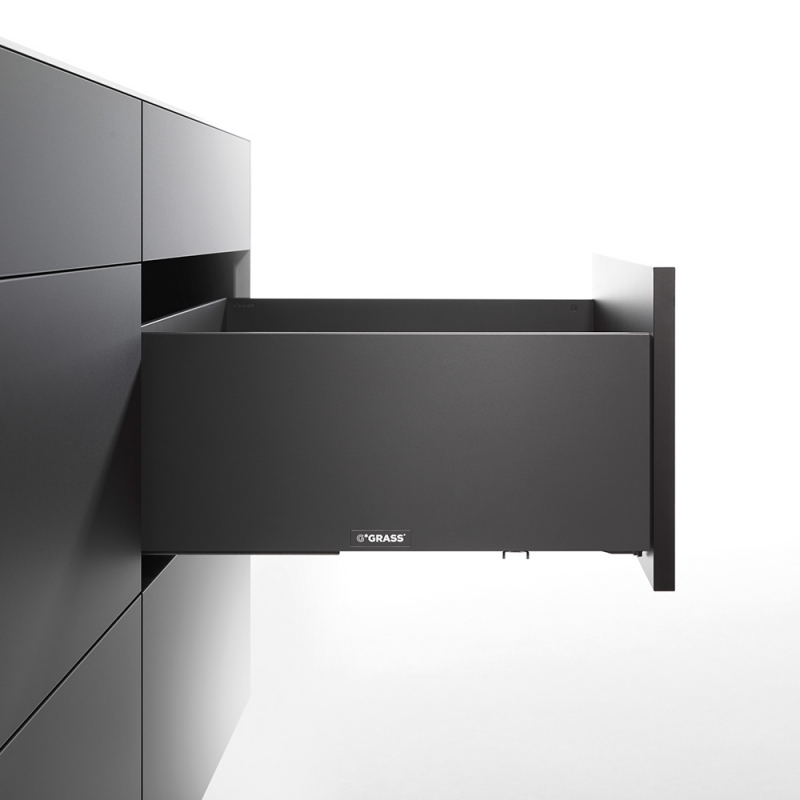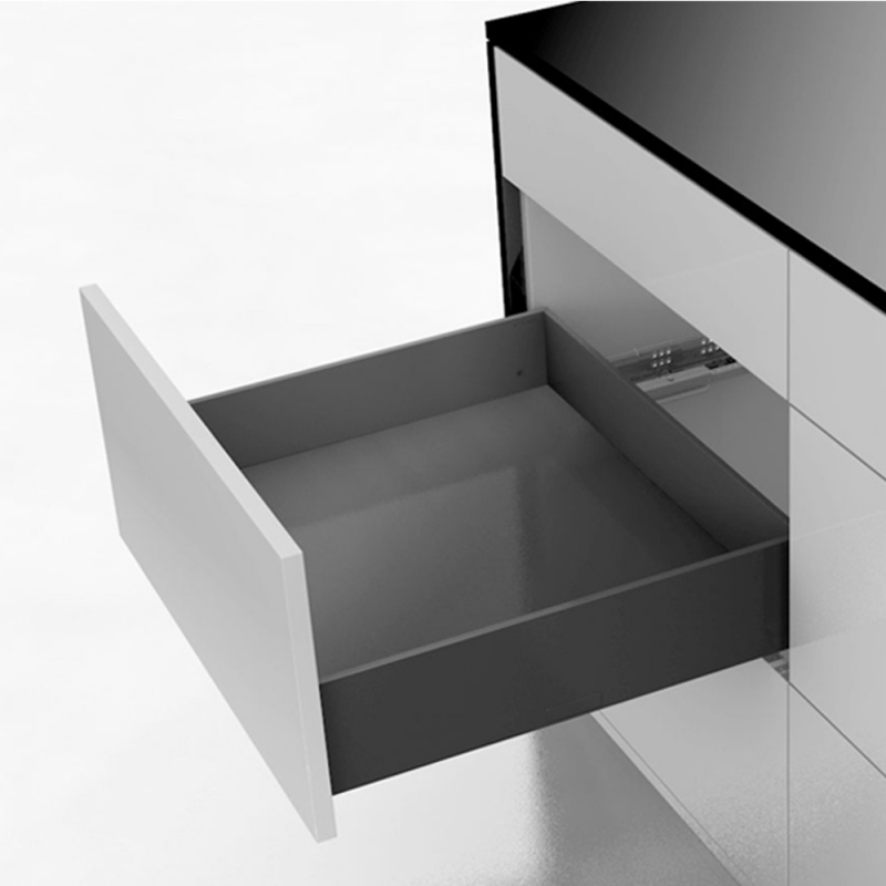 Ladsida-V8-H121Vionaro V8 är ett innovativt lådsystem med en tidlös, slimmad design och en helgjuten stål-lådsida på endast 8 mm – helt utan plast. Trots sin tunna form klarar produkten tunga belastningar och höga fronter upp till 780 mm med en mjuk och kontrollerad rörelse. Vionaro V8 passar perfekt i alla hem, från kök och badrum till vardagsrum och kontor, och erbjuds i den eleganta färgen Zircon – en varm, mineralisk nyans. Form, funktion och hållbarhet i ett.