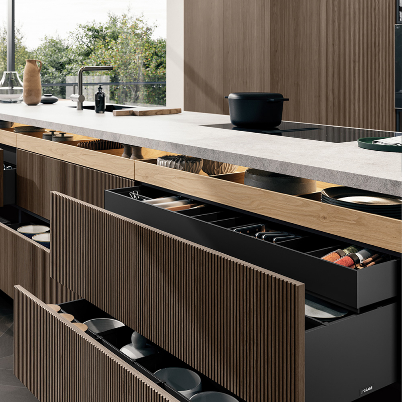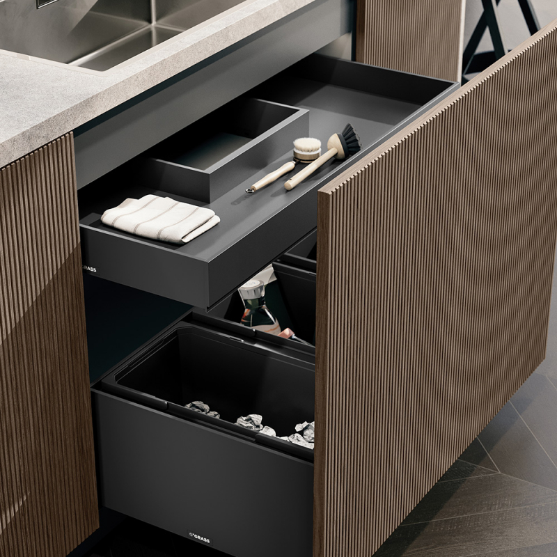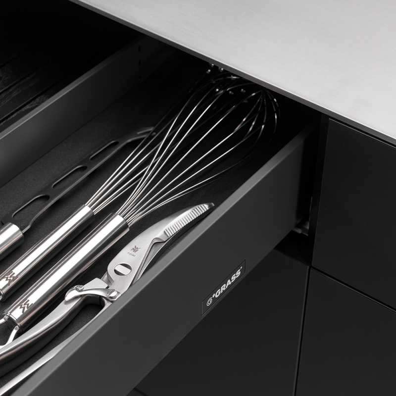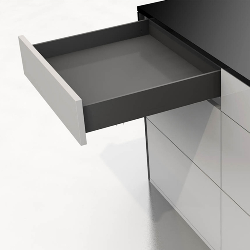 Ladsida-V8-H89Vionaro V8 är ett innovativt lådsystem med en tidlös, slimmad design och en helgjuten stål-lådsida på endast 8 mm – helt utan plast. Trots sin tunna form klarar produkten tunga belastningar och höga fronter upp till 780 mm med en mjuk och kontrollerad rörelse. Vionaro V8 passar perfekt i alla hem, från kök och badrum till vardagsrum och kontor, och erbjuds i den eleganta färgen Zircon – en varm, mineralisk nyans. Form, funktion och hållbarhet i ett.