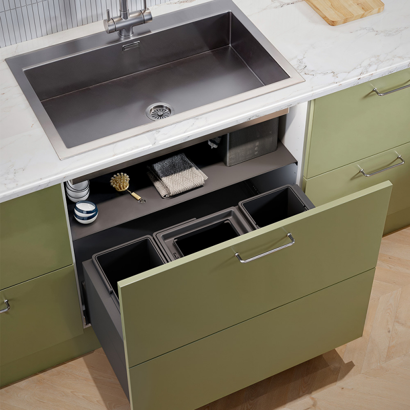 skapshylla-tidySkåpshyllan Tidy är den smarta lösningen för att optimera utrymmet i ditt kök. Med sin mörkgrå design och justerbara bredd (560–568 mm samt 760–768 mm) passar den perfekt i alla standardskåp. Hyllan är utformad för att placeras ovanför källsorteringen och ger en stabil och lättillgänglig förvaringsyta.
